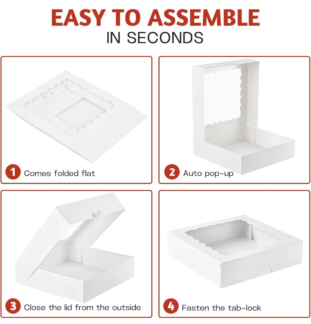 Wide Application: These 10" x 10" x 2.5" bakery boxes are ideal for 16-25 sugar cookies, 8-10 inches pies, 28-40 macarons, 16 cocoa bombs, 16-20 dipped strawberries, muffins, donuts and other bakery goods.