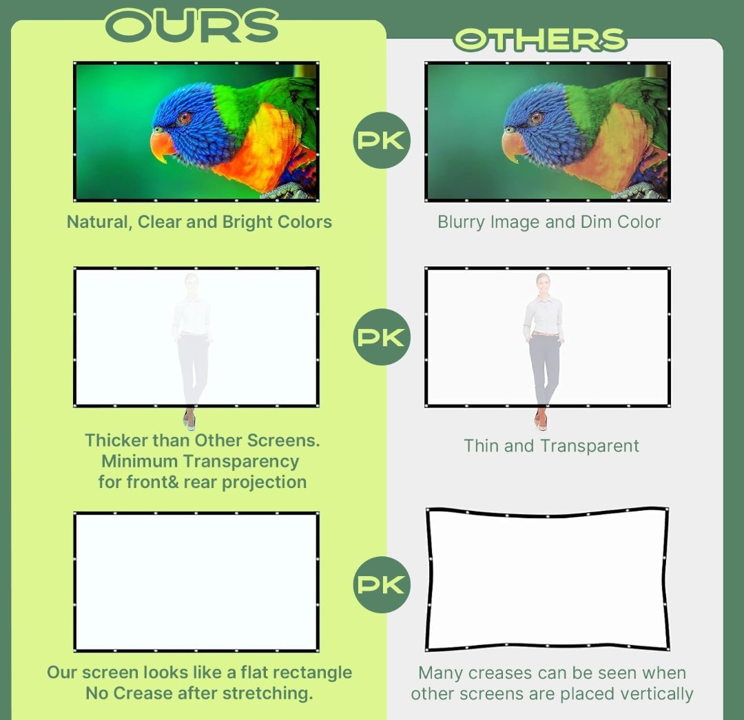 Projector Selection Advice:The 120 inch projector screen is designed with a diagonal 16:9 ratio and a wide viewing angle of 160°,making it very suitable for medium to long projection projectors.Use a high brightness projector during the day and an affordable projector at night to achieve 4K clarity and optimal viewing experience.
