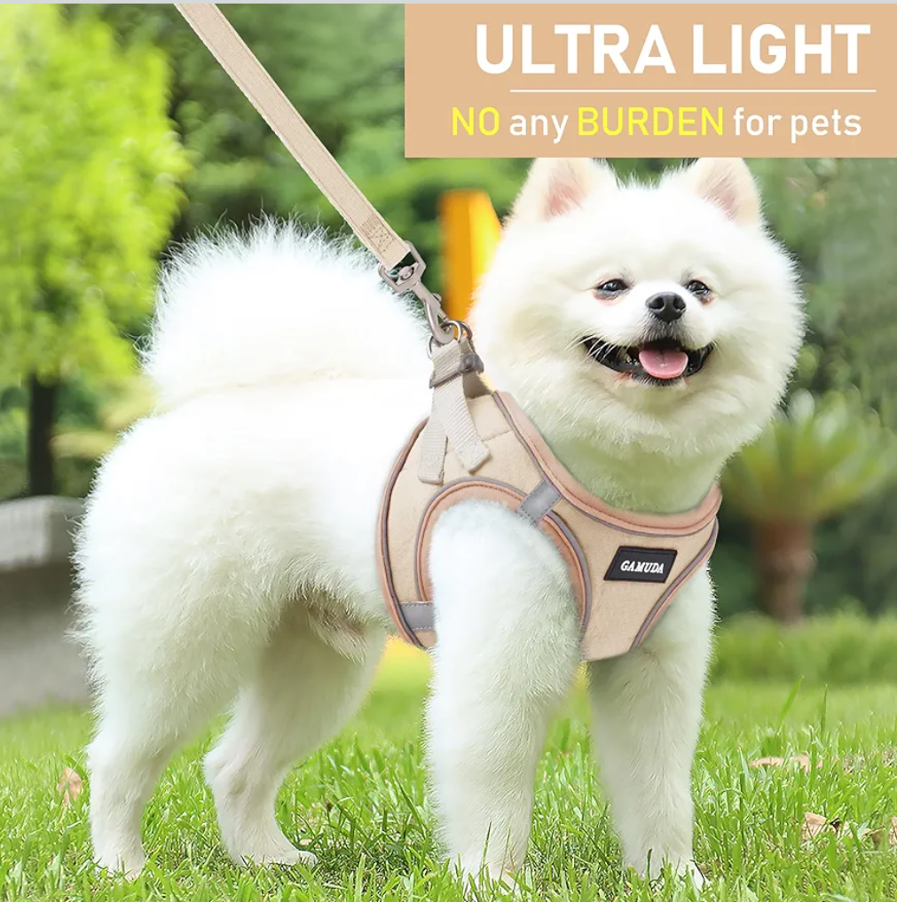 GAMUDA Small Pet Harness Collar and Leash Set, Step in No Chock No Pull Linen Fabric Soft Mesh Dog Vest Harnesses Reflective for Dogs Puppy Cats Kitten Rabbit (Khaki, XS)