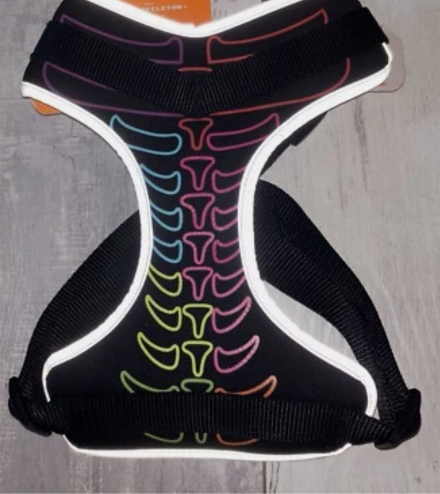 This is a Halloween Skeleton Glow Reflective and Adjustable Dog and Cat Harness from Hyde and EEK! Boutique. Size M