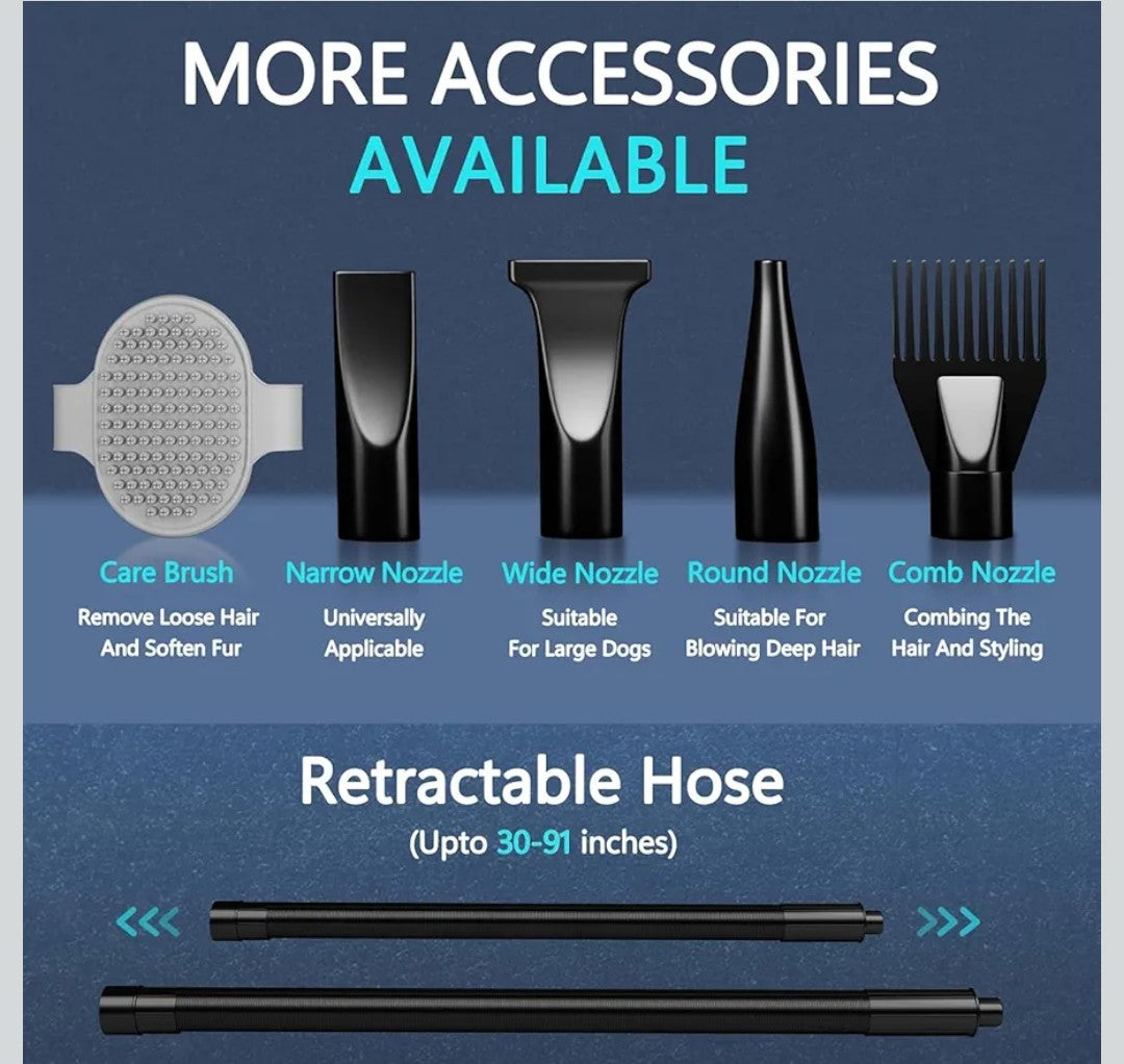 【Pet-Friendly Design】Featuring a durable one-piece ABS shell and advanced noise-reduction technology, this pet dryer operates at just 50-70 dB—15 dB quieter than standard dryers. The low-noise design keeps anxious pets calm, making it perfect for sensitive animals. Plus, the flexible hose extends up to 8.2 ft (2.5 m) for safe, hassle-free grooming.