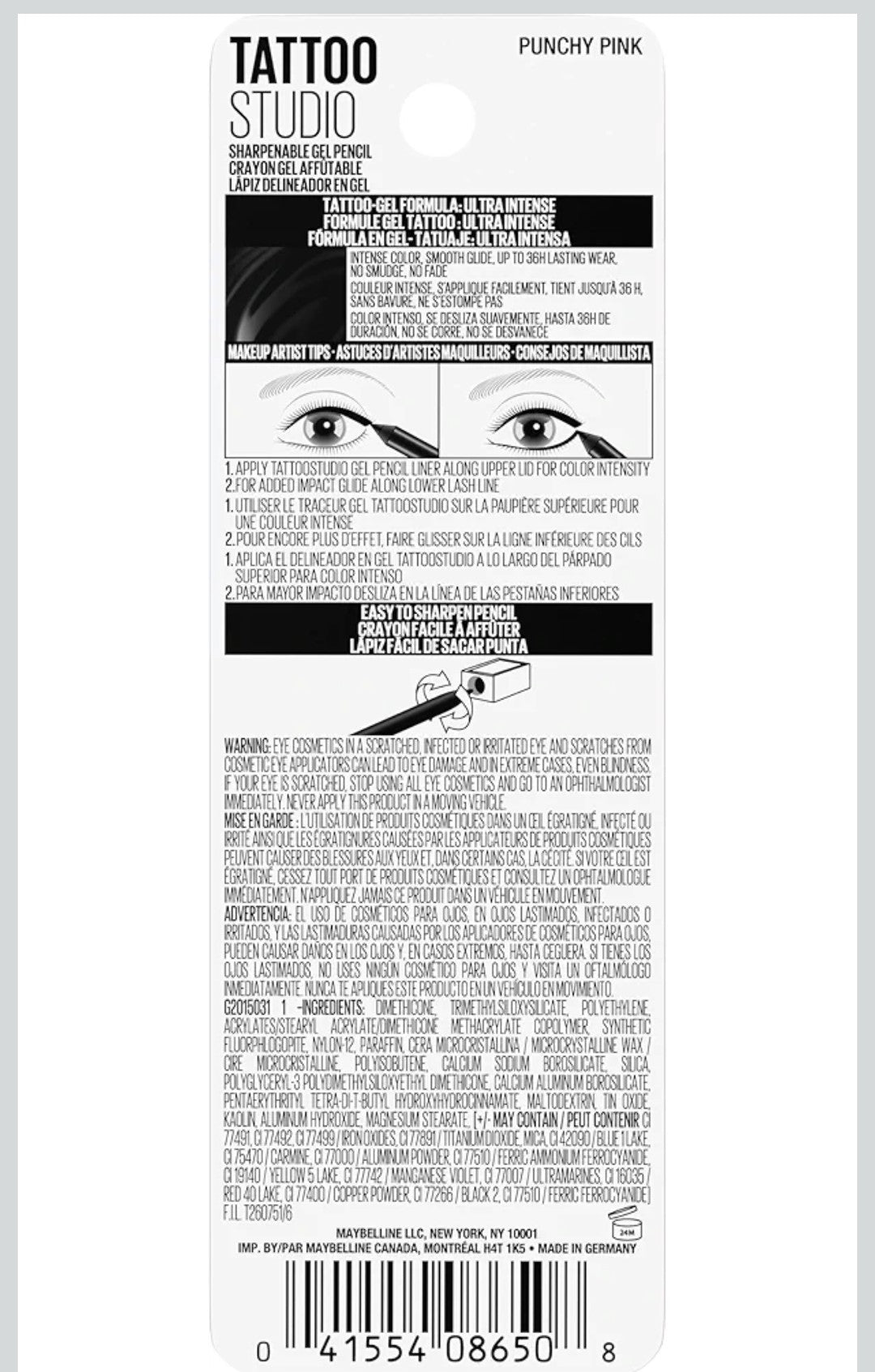 Maybelline Tattoo Studio Eyeliner: Delivering smooth lines and intense color, this waterproof eyeliner glides on to deliver intense eye definition in one stroke. This smudge resistant colorful eyeliner lasts 36 hours with no fading.