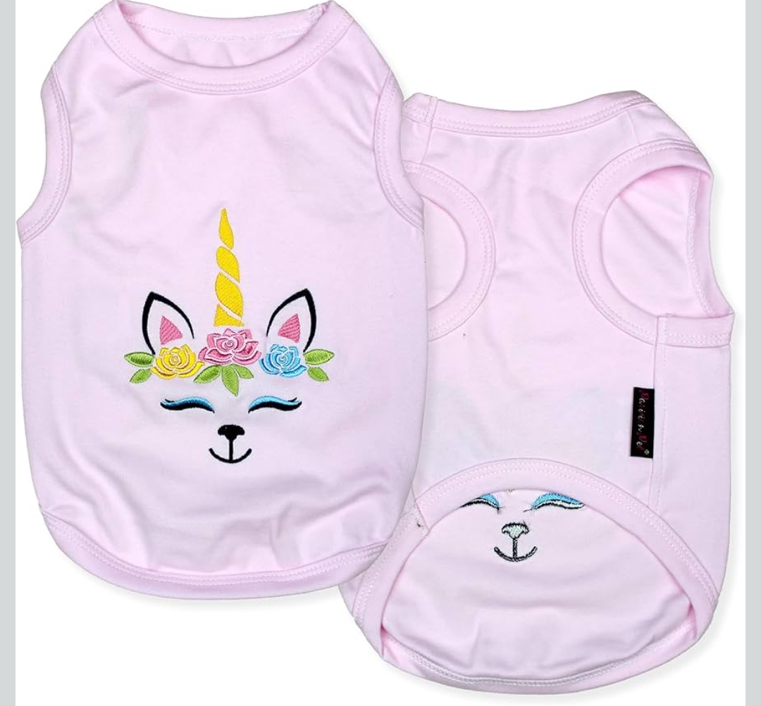 [EMBROIDERED SHIRTS FOR DOGS] - This charming pet t-shirt features a delicately embroidered unicorn horn and an adorable face, highlighting your furry friend's sweet and lovable nature. This girl dog shirt adds a touch of heavenly charm to your dog's wardrobe, making it perfect for showcasing their personality during walks, playdates, or special occasions.
