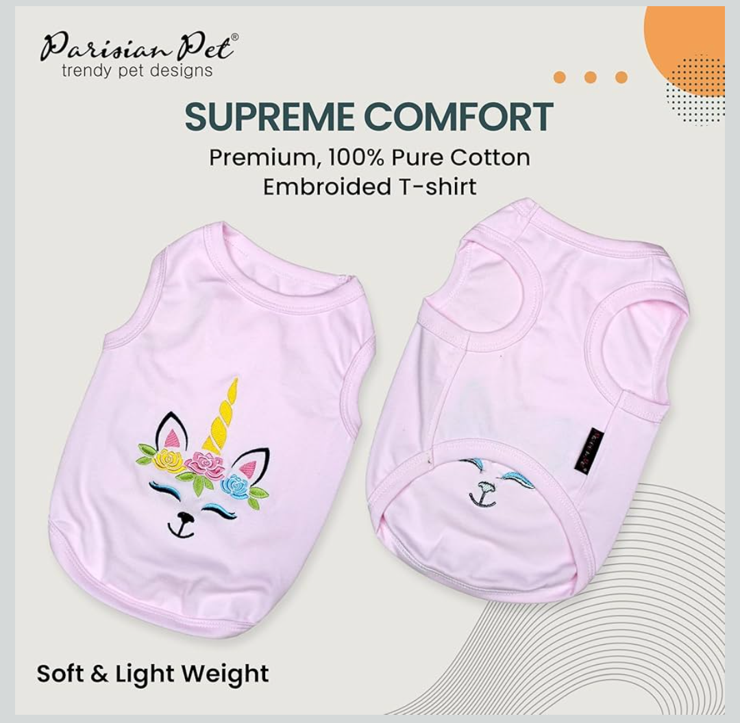 Parisian Pet Dog Tshirt - Embroidered Unicorn Dog Shirt - 100% Cotton, Lightweight Dog Clothes Female - Sleeveless Pink Dog Tee Shirts - L