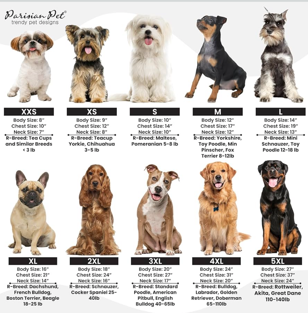 [ 80+ T-SHIRT DESIGNS FROM PARISIAN PET ] - Parisian Pet presents an exclusive range of over 80 beautifully embroidered dog tshirts designs, small dog shirts female ideal for multiple occasions, theme parties, and everyday wear. Available in a comprehensive size range from XXS to 3XL, our funny shirts for dogs collection ensures a perfect fit for dogs of all shapes and sizes. So update your pet's wardrobe with our high-quality, stylish t-shirts