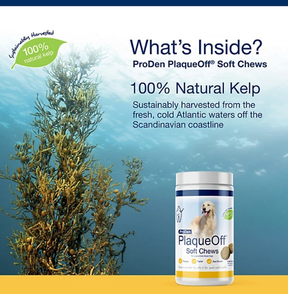 Take care of your pet's mouth with the ProDen PlaqueOff Soft Chews for Large and Giant Breed Dogs. Recommended to support healthy teeth, gums, and breath odor. The ProDen PlaqueOff key ingredient is 100% natural kelp and is sustainably harvested in the clear, cold waters off the Scandinavian coastline. Clinical trials on our kelp have shown to help reduce plaque and tartar while helping to improve bad breath. Comes in a 45 ct. package.