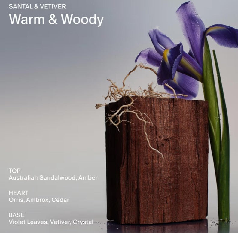 Iconic Scents — Santal & Vetiver is warm, woody, and creamy—like an open fire in the heart of the woods.