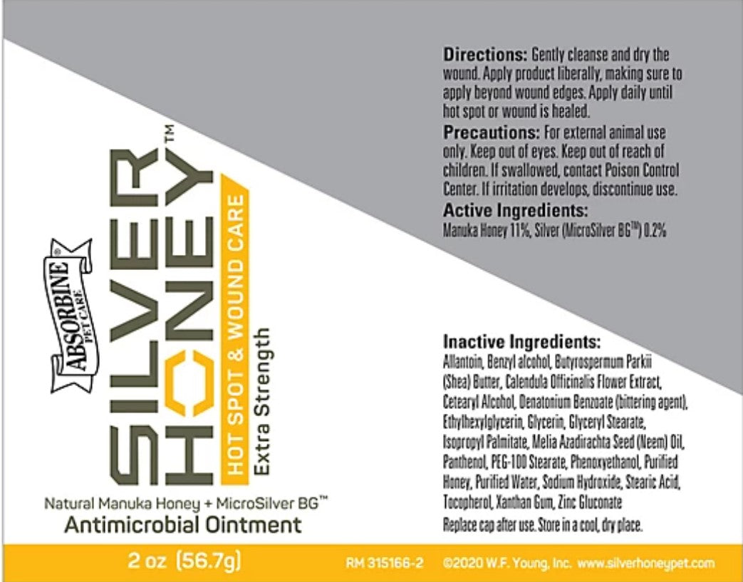 Apply Absorbine Silver Honey Hot Spot and Wound Care Antimicrobial Ointment for Pets to your dog's or cat's cuts and scrapes to help promote healing. A fast-acting antimicrobial ointment, Silver Honey works right away to stop 99.9% of bacteria, protecting the skin from infection. The formula is gentle and moisturizing, and it contains a bittering agent to help deter your pet from licking the wound. Silver Honey wound ointment for pets comes in a 2 oz., easy-to-use tube.How it Works.