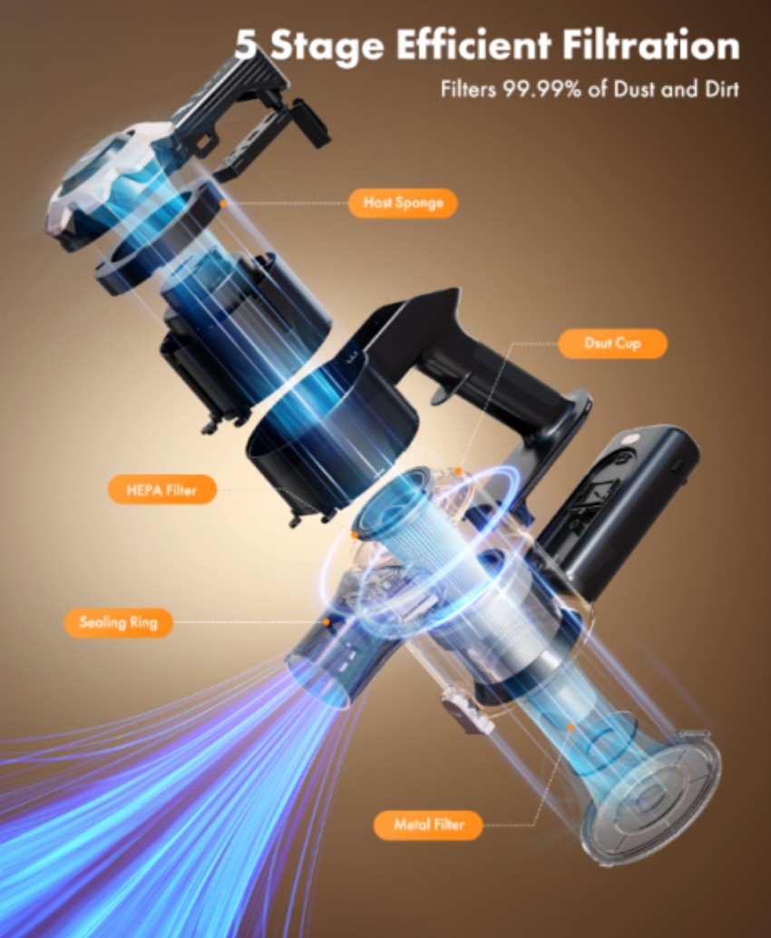 Included Components: Cordless Vacuum Cleaner x1; 7x2200mAh Battery Pack x1; Adjustable Extension Tube x1; 2-in-1 Crevice Tool x1; Sofa Brush x1; HEPA x2; Filter x1; Charger x1; Wall Hanger x1
