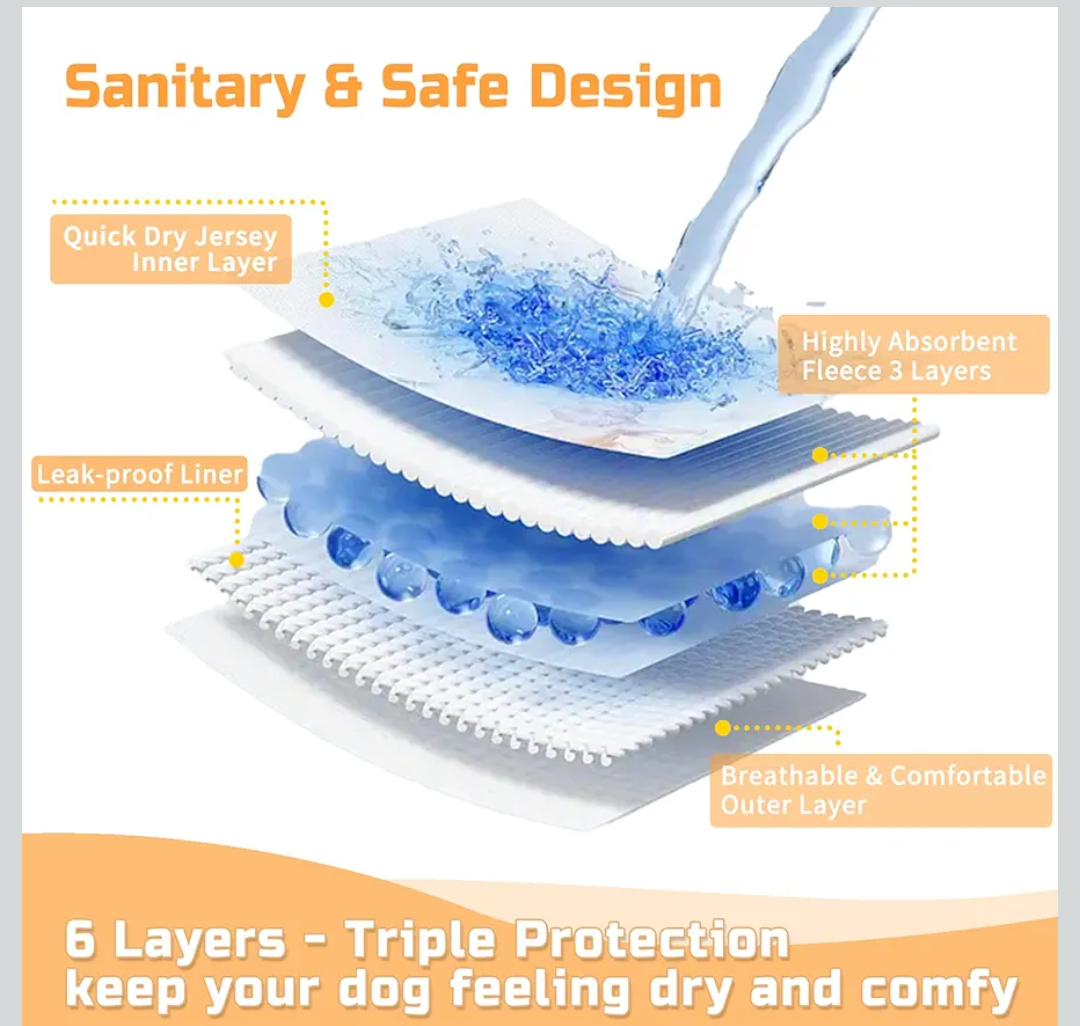 HIGHLY ABSORBENT & REUSABLE DOGGIE DIAPER - The washable dog diapers are made up of the breathable jersey inner wicks, 4 middle layers of highly absorbent fleece and smooth outer layer, which is sanitary and safe. Triple security protection, safety use for your pet. Because of the breathable, highly absorbent and soft material, the girl dog diaper can exclude hot moisture, cool comfort, bringing your girl a cozy feeling.
