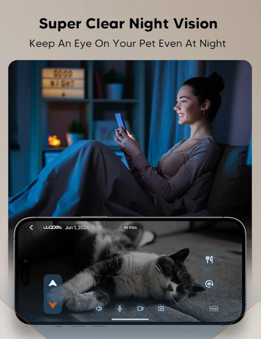 HD Camera with Night Vision: The automatic cat feeder features a high-resolution 1080P HD camera and a 160° ultra-wide-angle lens,providing clear and vivid image quality and capturing more details of your home at any time, day or night, using 4X digital zoom. WOPET cat camera has enhanced night vision with an effective distance of up to 33 ft. videos can be saved on micro SD cards up to 256G (4G SD card included).
