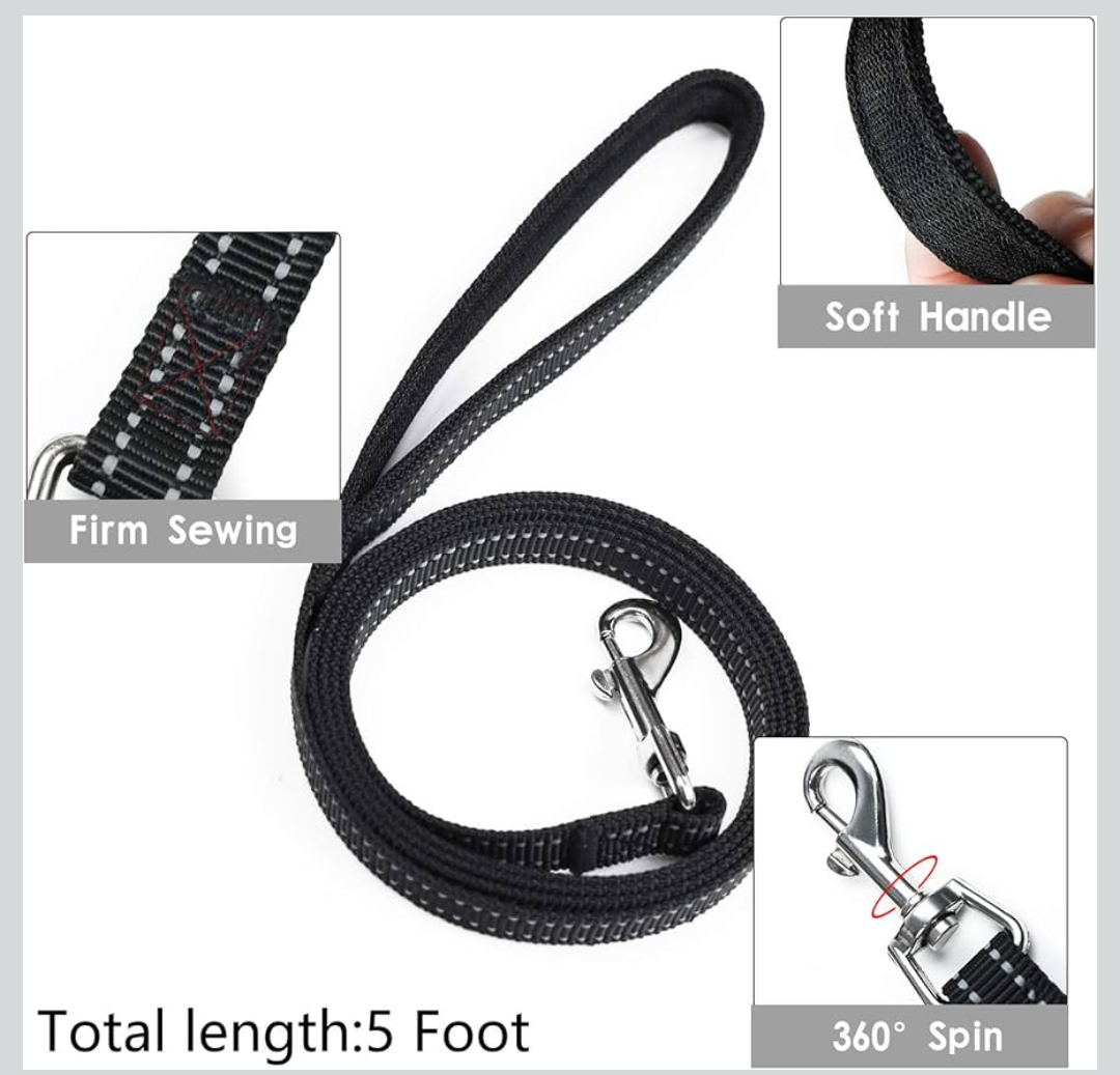 【Latest Reflective Design】The dog harness with 360-degree All-Over Reflective strip design, the leash is extended length (5 FT) with also have reflective effect, this harness and leash set makes your pet be visible at night, more easy control and safety.